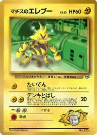 Lt. Surge's Electabuzz (Japanese: マチスのエレブー Matis's Eleboo) is a Lightning-type Basic Pokémon card. It was first released as part of the Gym Heroes expansion.
