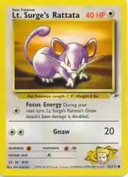 Lt. Surge's Rattata (Japanese: マチスのコラッタ Matis's Koratta) is a Colorless-type Basic Pokémon card. It is part of the Gym Heroes expansion.