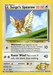 Lt. Surge's Spearow (Japanese: マチスのオニスズメ Matis's Onisuzume) is a Colorless-type Basic Pokémon card. It is part of the Gym Heroes expansion.