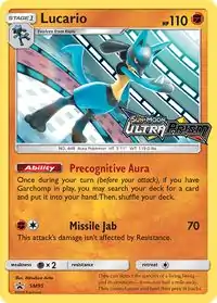 Lucario (Japanese: ルカリオ Lucario) is a Fighting-type Stage 1 Pokémon card. It was first released as part of the Ultra Prism expansion.