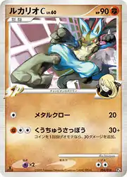 Champion Cynthia owns a level 60 Lucario in Pokémon Platinum. Metal Claw is a move in the Pokémon games that Lucario can learn. Mid-air Strike is an attack that first appeared on Monferno from Majestic Dawn. The interior of Cynthia's Room in Sinnoh's Pokémon League as it appears in Pokémon Platinum is featured in the illustration.