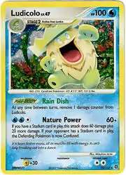 Rain Dish is an Ability in the Pokémon games that Ludicolo can have. Nature Power is a move in the Pokémon games that Ludicolo can learn. This card's Pokédex entry comes from Pokémon Diamond and Pearl.