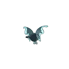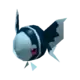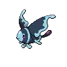 Lumineon is a fishlike Pokémon with dark blue scales. Its eyes are deep pink, and its face and eyelids are light blue. It has two pairs of large pectoral fins that resemble butterfly wings. These fins have wavy, light blue markings around the edges, and the lower pair is longer on the female. There is a band of light blue running vertically around its body. Its tail is long with a deep pink spot at the tip, and it has a pair of light blue pelvic fins.