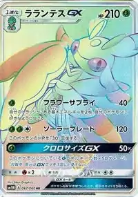 This card was included as a Regular card, a Full Art card, and as a Secret Rainbow Rare in the Sun & Moon expansion, first released in the Japanese Collection Moon, each with artwork by 5ban Graphics. The Regular print was reprinted as a Non Holofoil in the Japanese Grass Lurantis-GX Deck.