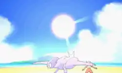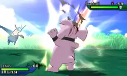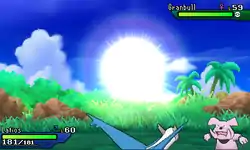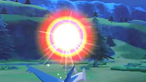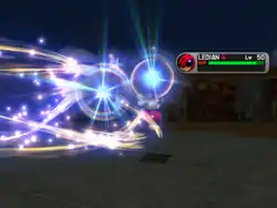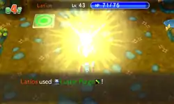 Latios opens his mouth and white sparkles form and gather in front of him, forming together into a pink ball of energy. He then fires a massive pink beam from the ball at the opponent. | ||