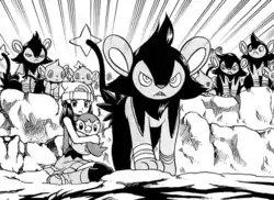 Platinum was attacked by a pack of wild Shinx and Luxio in Extreme Luxio. One of them, due to his broken claws, was unable to communicate with his group and was shunned by them. In an attempt to regain his group's favor, he battled with Diamond's Pokémon. Pearl eventually managed to get his comrades' trust and befriended the Luxio. Later, he evolved into a Luxray and joined Pearl's team after being named Rayler.
