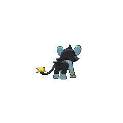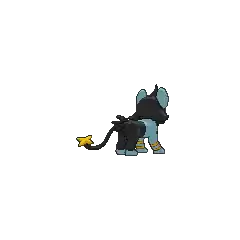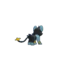 Luxio is a feline, quadrupedal Pokémon resembling a young lynx or lion. Blue and black fur covers most of its body. Its ears, face, hind paws, and front half of its body are blue, while its hindquarters are black. Additionally, Luxio has a tufty black mane surrounding its face. The mane is longer on the male Luxio, while the fur on the hind paws extends to ankles on the female. The insides of its rounded ears are yellow, as are its eyes. There are two yellow rings around each front leg and a yellow, four-point star on the tip of its tail.