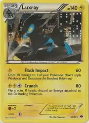 Flash Impact is an attack that first appeared on Luxray GL LV.X from Rising Rivals. Crunch is a move in the Pokémon games that Luxray can learn. This card's Pokédex entry comes from Pokémon Black and White.
