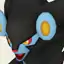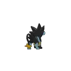 Luxray is a quadrupedal Pokémon resembling a fully-grown lion. While its face, hind legs, torso, and the back of its front legs are blue, much of its body is covered with shaggy, black fur. The fur is longer around the shoulders and the base of the tail, and forms a mane on its head. The mane is larger on the male than on the female. It has yellow eyes with red sclerae, a blunt muzzle, and rounded ears with yellow insides. There are three yellow, half rings on the back of each foreleg. Its long, thin tail is tipped with a yellow four-pointed star.