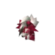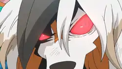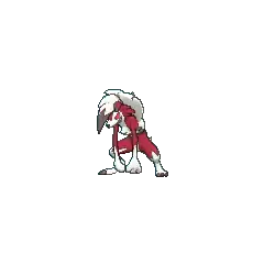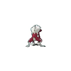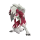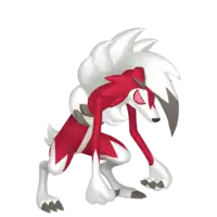 In its Midnight Form, Lycanroc instead resembles a slouched, bipedal wolf or werewolf. It has short red fur with white on its lower legs and a white streak that covers its face, underbelly, and tail. It has pointed, button ears with black tips, three large tufts of fur on each side of its face, a triangular black nose, and a mouth full of sharp teeth. While the sclerae, irises, and pupils of its eye are visible, they all glow a pinkish red and no distinctive colors are visible. A mane of fur covers its back and shoulders, sweeping forward over its head to form a crescent moon shape. On either side of its body, just below the shoulders, two small rocks resembling claws poke out of the mane. A single, bigger stone projects out of the front of the mane over its head. Each of this form's paws has three black claws, and it has a stubby tail covered in long fur.