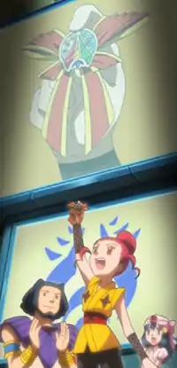 They start to climb up the enormous stairwell to go and see the instrument but start having trouble getting up the stairs because there are so many. Ash begins to get exhausted, only to see his friends riding in the hot air balloon to the top. Eventually reaching the top, they enter the new music disk and start the musical instrument as it begins to play. The whole town hears it as people start dancing in the streets. Having demonstrated this, the group heads back down to the ground, where they meet the trio of Trainers from before and is another battle. Meanwhile, in the other dimension, Palkia and Dialga continue fighting, causing another disturbance indication on Tonio's computer. Palkia tries to get away from Dialga and enters through a portal to try to escape it. The portal opens up in the real world, causing a pink light to shine, and strong winds to blow through the town. The portal eventually closes, leaving Dialga alone.