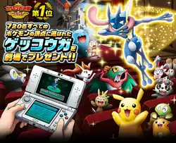 A CoroCoro sponsored election was issued to decide the distribution Pokémon for the movie, among others. Greninja won first place, with runner ups including Arceus, Mew, Pikachu, and Sylveon as second, third, fourth, and fifth place, respectively, as well as Simisear ranking last place at 720. When distributed, Greninja came with a Master Ball as a held item.