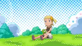 Bonnie plays and strolls in the grass along with Squishy while Clemont, Ash, and Serena watch.