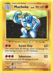 Karate Chop and Submission are moves in the Pokémon games that Machoke can learn. This card's Pokédex entry comes from Pokémon Red and Green, and Pokémon FireRed. This card is based on Base Set Machoke.