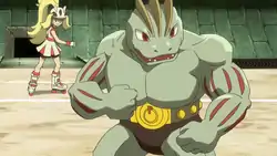 In Showdown at the Shalour Gym!, Korrina used a Machoke in her Gym battle against Ash. It battled Fletchinder, but it was defeated.