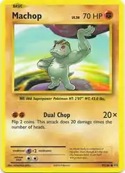 Dual Chop is a move in the Pokémon games that Machop can learn. This card's Pokédex entry comes from Pokémon Red and Green, Pokémon FireRed, and Pokémon Y. This card is based on Base Set Machop.