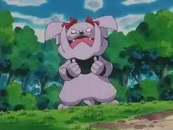 Madame Muchmoney's Granbull (Japanese: カネヨのグランブル Kaneyo's Granbulu) was a runaway Pokémon who took a liking to Meowth's tail and continued to follow the Team Rocket across the Johto region. She later returned to her Trainer's side after Madame Muchmoney had become stronger as a Trainer. | ||