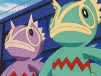 When playing in their room, Greeny spotted Meowth with Alexa's jewelry box, and it quickly used its tongue to snatch it from him. Later the Kecleon went missing and the group tried to find them; Team Rocket were pursuing the Kecleon, which were running all around the blimp. The Kecleon were able to escape on several occasions, and in the end, Team Rocket were sent blasting off. Madison and Alexa were happily reunited with their troublesome Pokémon, and returned a stolen gentleman's first aid kit, which the Kecleon had also stolen. Reddy and Greeny's known moves are Lick and Psybeam, and their Ability is Color Change. | ||