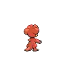 Magby is a bipedal Pokémon that has a red body with a yellow, flame-shaped marking on its stomach. Its head is covered with large lumps, and it has a rounded, yellow beak. There is a single spike on its back and it has a tapered tail. Its short arms have three clawed fingers, while its feet have only two clawed toes.