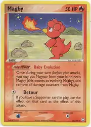 Magby (Japanese: ブビィ Buby) is a Fire-type Basic Pokémon card. It is part of the EX Team Rocket Returns expansion.