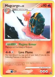 Magma Armor is an Ability in the Pokémon games that Magcargo can have. Lava Plume is a move in the Pokémon games that Magcargo can learn. This card's Pokédex entry comes from Pokémon Diamond and Pearl.