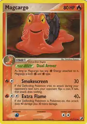 Magcargo (Japanese: マグカルゴ Magcargot) is a Fire-type Stage 1 Pokémon card. It is part of the EX Unseen Forces expansion.