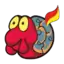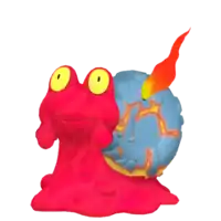 Magcargo is a limbless, snail-like Pokémon consisting almost entirely of bright red magma. Its oval eyes are large and yellow with small pupils, and extend upward from its head. It has a bulbous snout and a wide mouth, with two drops of magma dangling from each side of its upper jaw. Magcargo's back is protected by a gray, spherical shell composed of hardened, but brittle magma, forming irregular lumps and plates. A streak of fire leaks from the side of its shell. Magcargo's lower body is amorphous and covered in bubbles of magma.