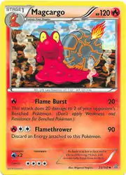 Flame Burst and Flamethrower are both moves in the Pokémon games that Magcargo can learn. This card's Pokédex entry comes from Pokémon Y.
