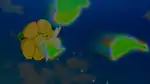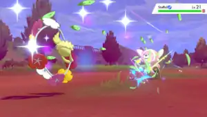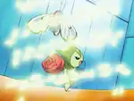 Cherubi jumps up and flips around, releasing multiple glowing yellow or green leaves from the top two leaves on its head, or its body. | ||