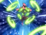 Roserade releases glowing light green leaves from the flowers at the end of its arms at the opponent, or Roserade spins around quickly and it releases glowing light green leaves from its body at the opponent. Sometimes, the flowers on the end of its arms glow light green before firing the attack. | ||