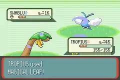| Tropius raises its top two leaves on its back and they start to glow brightly. It then waves them and a large blade of energy comes out of them and hits the opponent. The attack never misses. | |||