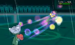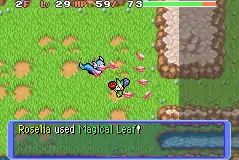 Roselia releases glowing white leaves from the flowers at the end of its arms at the opponent, or Roselia spins around quickly and releases glowing light green leaves from its body at the opponent. Sometimes, the flowers on the end of its arms glow white before firing the attack. | ||
