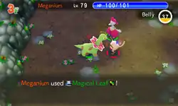 In Red Rescue Team and Blue Rescue Team and Explorers of Time and Darkness and Sky, Magical Leaf is a move with 12 base power and 8PP that ignores accuracy and evasion checks. The user attacks enemy in front of them, while cutting corners.