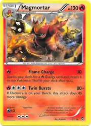 Magmortar (Japanese: ブーバーン Booburn) is a Fire-type Stage 1 Pokémon card. It is part of the Furious Fists expansion.
