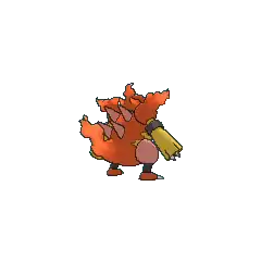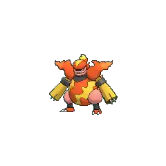 When Magmortar prepares to shoot fire from its hands, the claws are capable of disappearing into its skin, forming a pressurized cannon. It blasts fireballs of over 3,600 °F (2,000 °C) burning foes to a blackened crisp, though avoids this method when hunting prey. Magmortar increases its body temperature by inhaling deeply, increasing the fire burning with its belly. When firing, its body can turn into a whitish hue from the intense heat. Its arm starts melting when it fires a whole barrage. Magmortar is used in some factories in order to process metal. It lives in volcanic craters, with a single pair of male and female Magmortar occupying one.