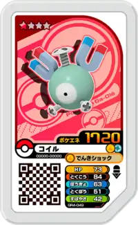 Magnemite (Japanese: コイル Coil) is a Grade 1 Pokémon Ga-Olé disk. It is part of the fourth Grand Rush set.