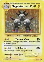 Thunder Wave and Self-Destruct are both moves in the Pokémon games. Magneton can learn Thunder Wave, but not Self-Destruct. This card's Pokédex entry comes from Pokémon Red and Green, Pokémon FireRed, and Pokémon X. This card is based on Base Set Magneton.