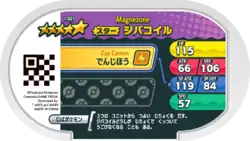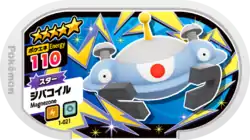 Magnezone (Japanese: ジバコイル Jibacoil) is a Grade 5 Pokémon Mezastar tag. It is part of the first set.