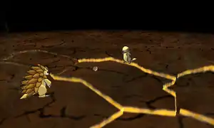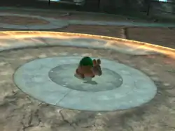 Golem's body becomes outlined in a brown aura. It then jumps into the air and stomps on the ground, creating an earthquake. The move's power varies with each usage. | ||