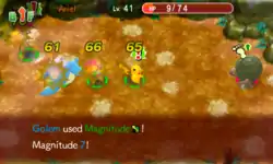 In Red Rescue Team and Blue Rescue Team and Explorers of Time, Darkness and Sky, Magnitude has 15PP and 100% accuracy. The user attacks all other Pokémon in the room, dealing fixed damage dependent on the magnitude level: 5, 10, 15, 25, 30, 35 or 40; afterwards multiplying the damage by STAB and type matchup. The move deals double damage to Pokémon in middle of Dig. In hallways, this move targets Pokémon up two tiles away (or one in one-tile darkness).