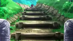The Mahalo Trail is a narrow trail that winds upward through mountainous terrain. The trail cuts through the terrain in a switchback fashion, forming steep walls to either side. The top of these walls often rises into more cliffs and hills, or grows wild with a variety of trees and bushes. In some places, stout statues dot the sides of the trail, with some statues positioned atop the walls of the trail as well. It leads to the Plank Bridge, a wooden bridge spanning a wide ravine with a river running through it. Near the start of the game, Nebby destroys the bridge, but after the player becomes ChampionSM/defeats Ilima at Hau'oli Cemetery during Mina's trialUSUM, it will have been restored.