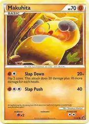 Slap Down is an attack that first appeared on Hariyama from EX Ruby & Sapphire. Slap Push is an attack that first appeared on Makuhita, also from EX Ruby & Sapphire. This card's Pokédex entry comes from Pokémon HeartGold and SoulSilver.