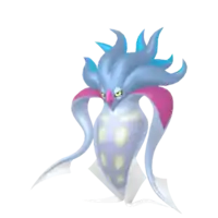 Malamar is a Pokémon that resembles an upside-down squid. Several purple tentacles with bright blue undersides sprout from the top of its head. It has yellow eyes with black sclerae, a dark pink beak-like mouth, and lighter purple eyelids. Its main body is dark purple and has six circular yellow lights on the front and back. There is also a yellow stripe nearly encircling its upper body. Covering its main body is a transparent mantle with two white fins on the bottom that function as legs. On each side of the mantle is a long tentacle with dark pink at the top and white, scythe-like fins at the ends.