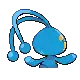 Manaphy is a small, blue, aquatic Pokémon with stubby feet and club-like arms that are longer than its body. It has a red gem on its chest and a yellow dot below the gem. Its onion-shaped head has a pair of long blue antennae, which have small spheres on the ends. Its irises are dark blue with yellow sclerae, and there are two yellow dots of "eyelash" markings extending from the eyes.