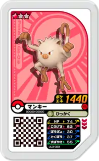 Mankey (Japanese: マンキー Mankey) is a Grade 1 Pokémon Ga-Olé disk. It is part of the third Ultra Legend set.