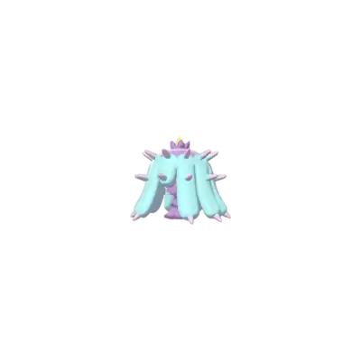 Mareanie is a Pokémon with a purple, stalk-like body and head. It has blue eyes with yellow pupils and sclerae, and three pointed teeth. The body consists of two sections; the top section is slightly smaller and overlaps the lower. On top of its head is a starfish-like collection of ten tentacles. All of the tentacles reach the ground, except for the one directly in front, which is shorter and leaves its face exposed. The tentacles are light blue and covered in purple spines. On top of its head is a purple area with a collection of spikes with a larger, yellow spine in the center. Mareanie is able to regenerate any body part overnight, except its head.