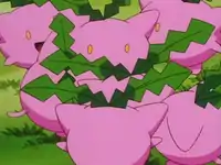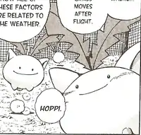 Later, Team Rocket attacked using a fan to try to blow them away, but they were quickly taken back by Ash and his friends including Mariah and Oddish, and send Team Rocket blasting off. That night, a tornado ripped through Mariah's house and sent the Hoppip and Oddish flying away. Oddish was able to retrieve two but the other were captured once again by Team Rocket. When the group found Team Rocket, Oddish stepped in and sent them blasting off, freeing the Hoppip. None of Hoppip's moves are known. | ||
