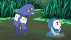Dawn's Piplup then offered to lead the way and find safe spots for them to walk on. However, he ended up getting himself trapped in the sand and Dawn had to call out her Buneary to freeze Piplup with Ice Beam in order to prevent him from sinking any further and rescue him. After that, Brock sent out his Croagunk to help out and he was able to guide them safely, even rescuing Piplup when he fell into quicksand a second time.