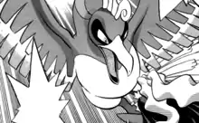 Although the appearance of Ho-Oh was alluded to as early as flashbacks in the Red, Green & Blue chapter, where it was described as being a huge bird Pokémon that kidnapped Green, it wasn't until midway into the Gold, Silver & Crystal chapter that it made its first true appearance. There, it clashed with its former master, who had earlier had a team of Team Rocket Grunts demolish the Tin Tower and most of Ecruteak City to draw it out. Soon enough, its battle with "him" was shown to Gold and Crystal, confounding them as the Masked Man's identity was narrowed down to those among the 16 Gym Leaders in Johto and Kanto. Eventually, it was caught by the Pokégear-controlled dummy that was set up by Masked Man, and rampaged in Indigo Plateau alongside Lugia. Soon, after its Rainbow Wing had been extracted, both the Legendary Pokémon were lent to Karen and Will, and fought against Green's Legendary birds, and was eventually brought back to its senses. As it has yet to be shown upon it regaining freedom, it is not known where it and Lugia ended up settling in. | ||
