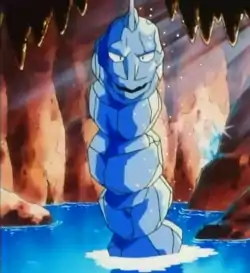 The Crystal Onix was rumoured to live on Sunburst Island, though is largely ignored by many as just a legend. Its body is made entirely of crystal glass, making it unusually strong to Water attacks, but weak to Fire attacks. Mateo was determined to capture this Crystal Onix after hearing about from his late grandfather, who was left awe-inspired after he encountered it in his youth. Together, with the help of Ash and his friends, Mateo located the Crystal Onix living within the crystal caves on an isolated islet. While his Cloyster's Water attacks failed to hurt the Crystal Onix, Mateo's Charmeleon's Fire attacks did significant damage. Mateo was just about to capture it when he realized that he didn't need to. Just battling it gave him the inspiration he needed to create realistic glass Pokémon sculptures. He thanked the Crystal Onix as it submerged itself into the water once more. The Crystal Onix's known moves are Tackle and Rock Throw. | ||